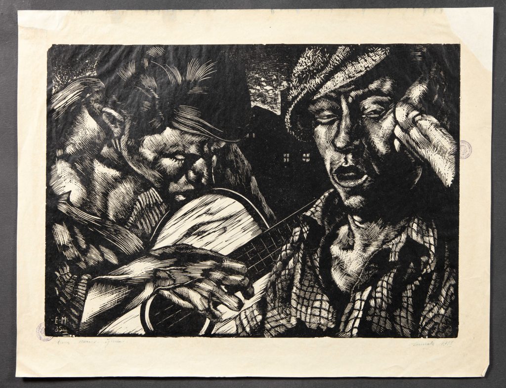 Enea Marras (Iglesias, 1916 – 1940) was a Sardinian engraver and painter active in the 1930s. He trained in the artistic circle surrounding Remo Branca, a key figure in the revival of woodcuts in Sardinia. His production, tragically interrupted by his premature death at just twenty-three, focused primarily on woodcuts, a technique through which he developed a pared-down language, attentive to chiaroscuro contrasts and compositional rhythms. His works depict scenes of everyday life, rural settings, and popular figures, rendered in a concise yet intense style. Marras’s engravings are preserved at the University Library of Cagliari, in the “Anna Marongiu Pernis” Prints and Drawings Collection, which houses a significant collection of twentieth-century Sardinian graphic art. The core collection was formed primarily after World War II thanks to donations from artists and families, with the aim of documenting the island’s engraving scene. The preserved corpus is not very large, but it has a high documentary value: it represents one of the main public testimonies of Marras’s activity and helps to outline his artistic profile within Sardinian graphic art of the early twentieth century.