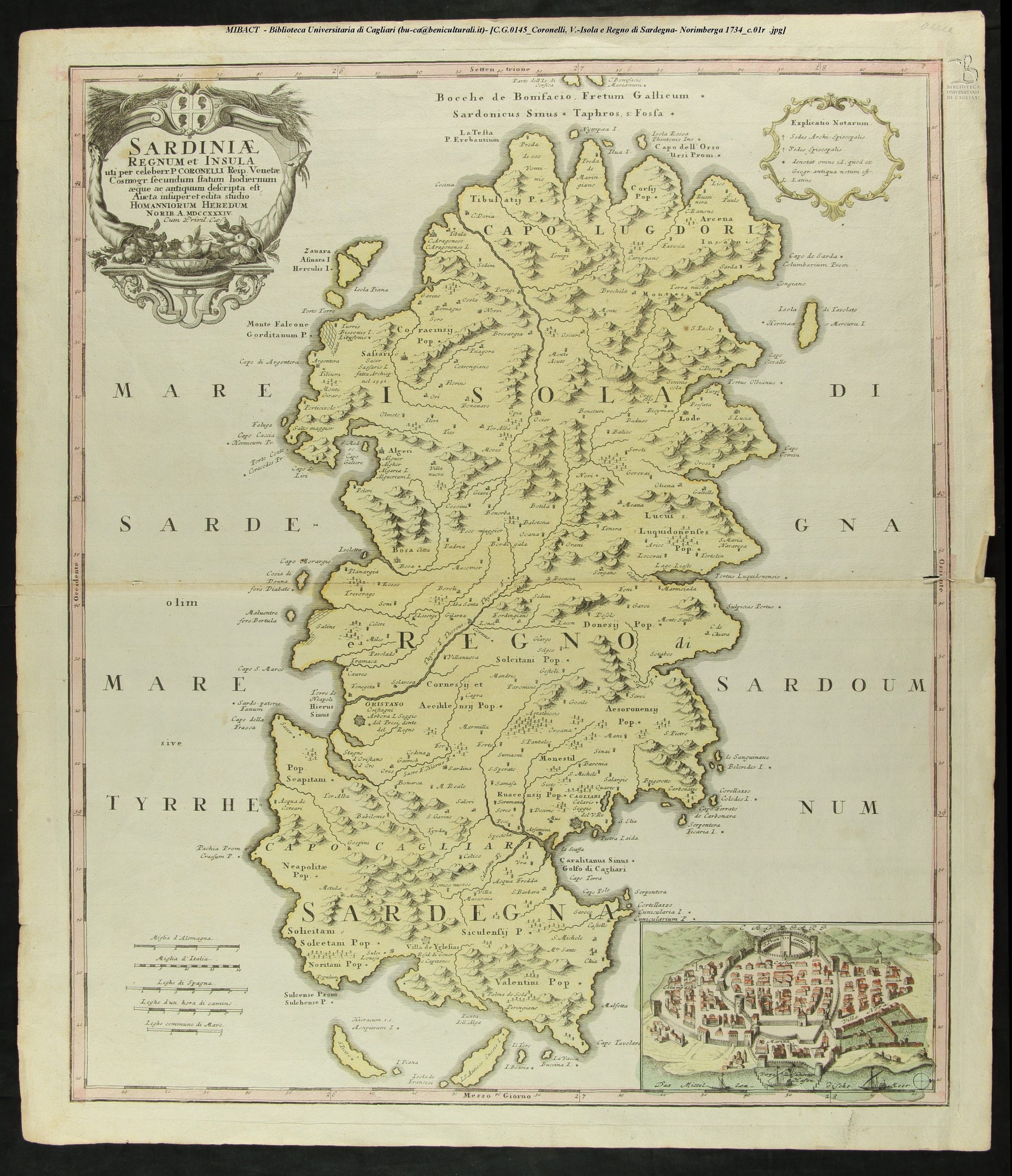 There are numerous maps of Sardinia, including those by the Dutch cartographers Jansson and Mercator, the Frenchman Sanson (1600-1667), cartographer to the King of France, the Germans Seutter and Homann, and the Italian Coronelli (1650-1718), cosmographer of the Republic of Venice.