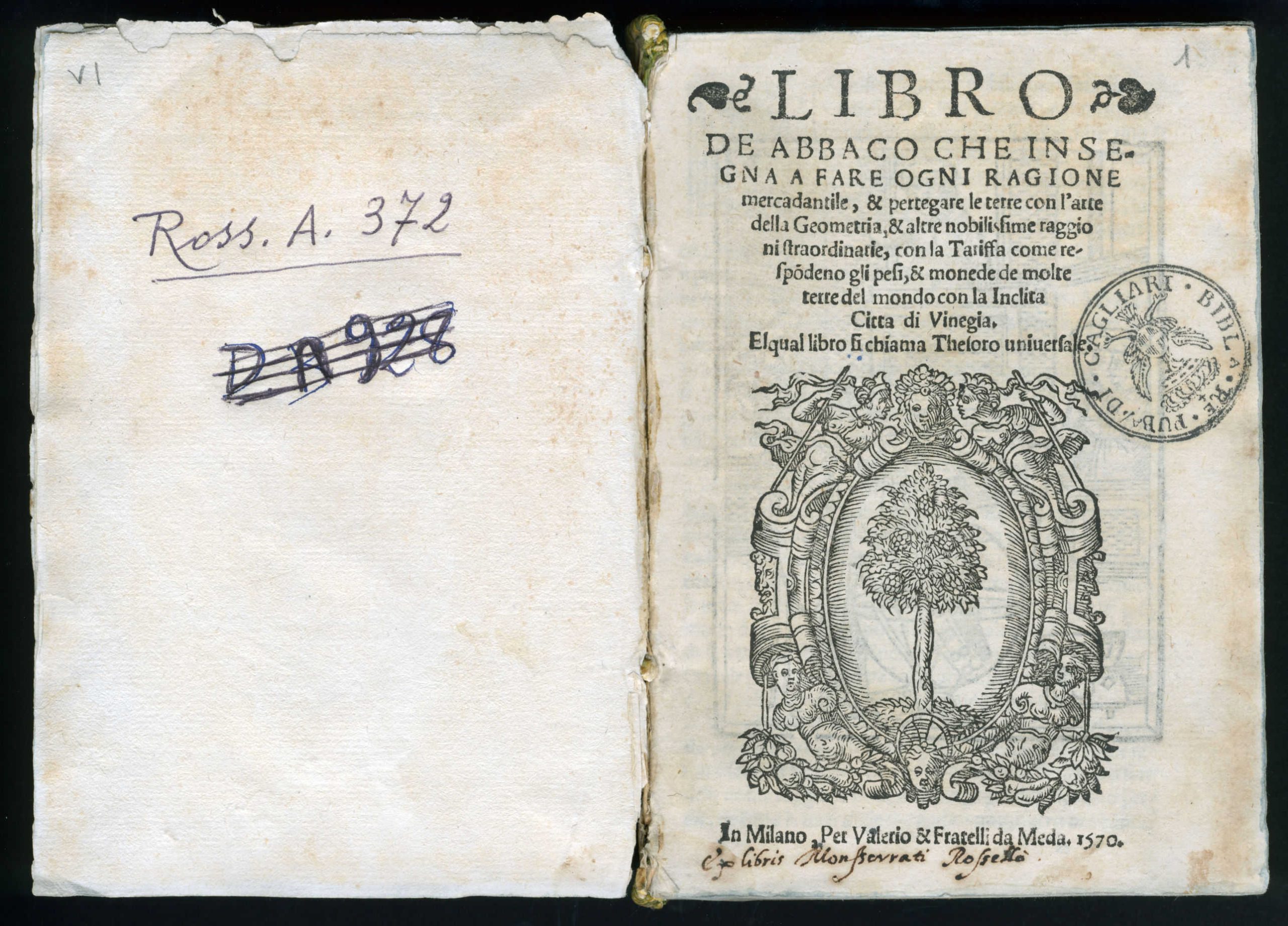 A jurist and bibliophile of Majorcan origin (Cagliari, c. 1560–1613), Monserrat Rossellò owned one of the most important private libraries in modern Sardinia (about 4,500 editions), which he bequeathed to the Jesuit College of Santa Croce along with an annual income of 25 ducats to purchase new books, with the clause that they bear the Monserrati Rossellò ex libris. Following the suppression of the Society of Jesus in 1773, his entire collection passed to the University Library of Cagliari. The most important section is represented by works of a religious nature, but there are also numerous works on civil and canon law. There are also Greek and Latin classics, philosophical texts, treatises on medicine, botany, mathematics, and geometry, some poetic works by Sardinian writers such as Antonio Cano, Antonio lo Frasso, and Gerolamo Araolla, and important texts published in Cagliari in the printing house founded in 1566 by Niccolò Canelles. There are also some extremely rare items, such as the Bible printed in Lyon in 1494 by Mathias Huss (Inc. 95), of which no other copies are known to exist in Italy.