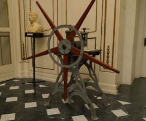 The room houses some sculptures: in front of the windows, there is an 18th-century bust of the historian Giuseppe Manno, made by the sculptor from Alghero, Moccia; to the right of the entrance, a bust of the painter and engraver Felice Melis Marini, created in the 20th century by Anna Cabras Brundo. The room is also enriched by a late 19th-century globe by the Turin geographer Cora and a printing press for engravings that belonged to the Cagliari artist Anna Marongiu Pernis, who tragically passed away at a young age in 1941.