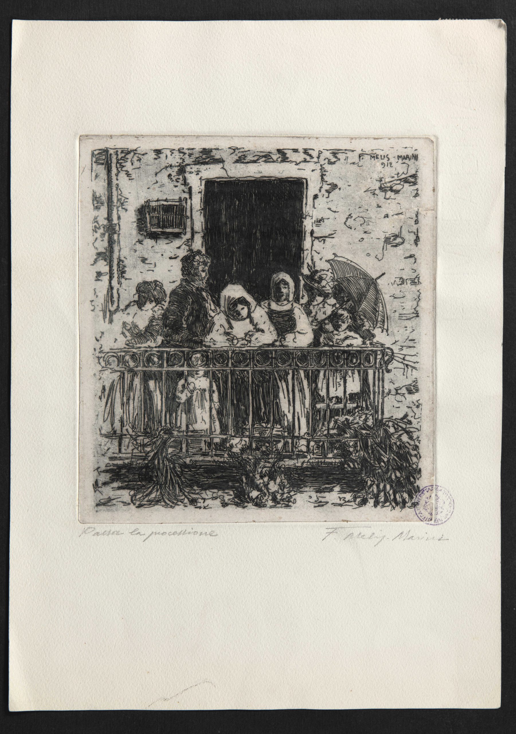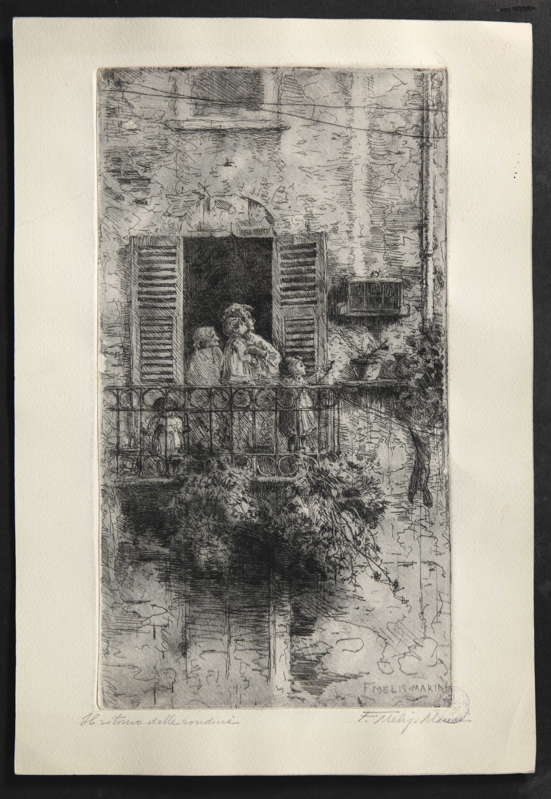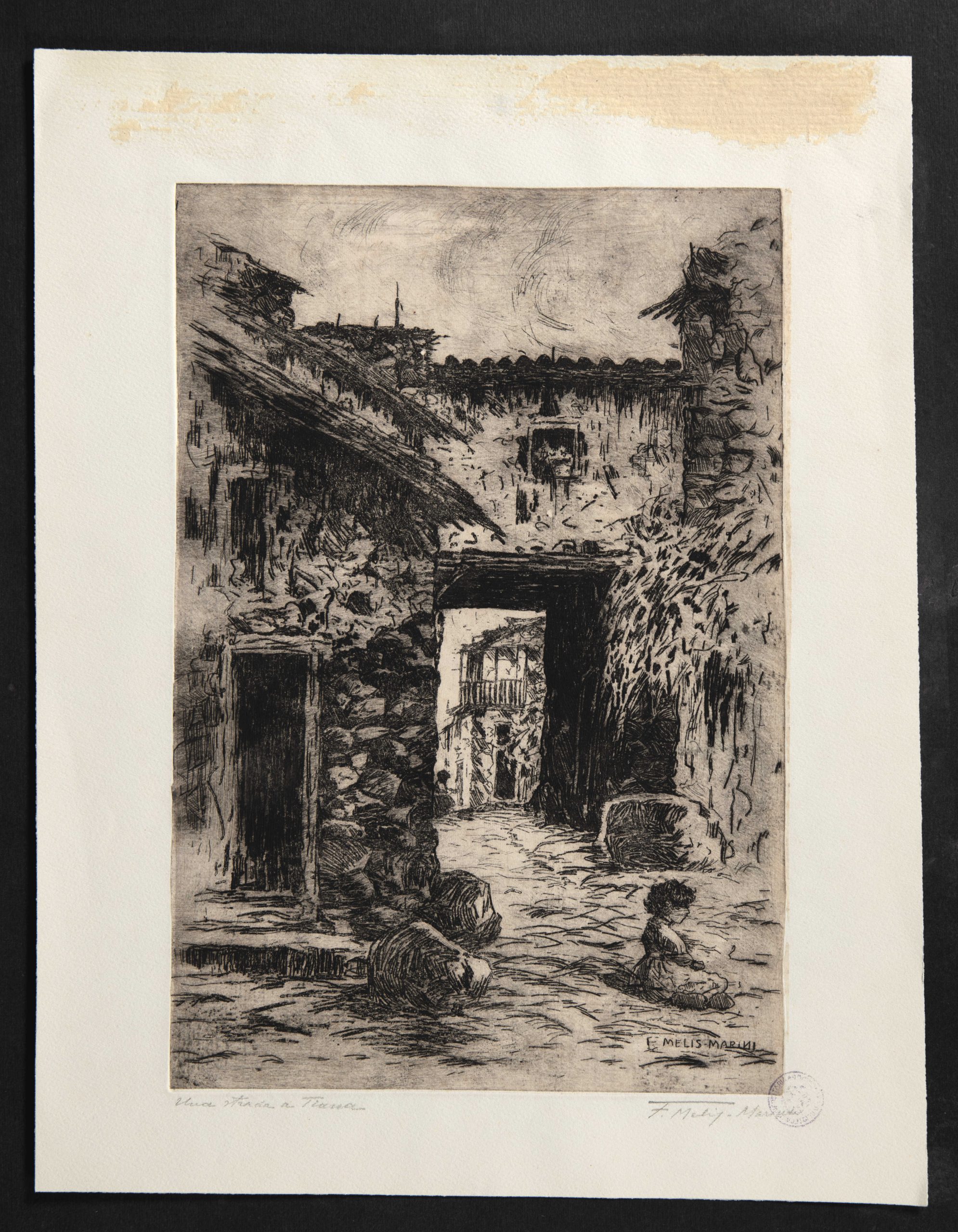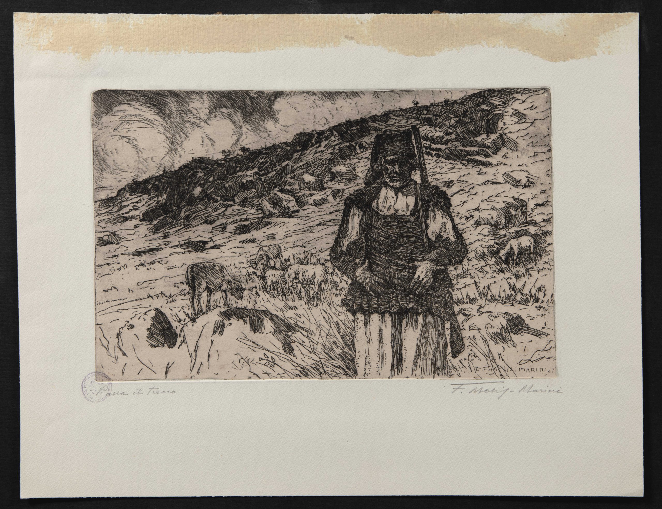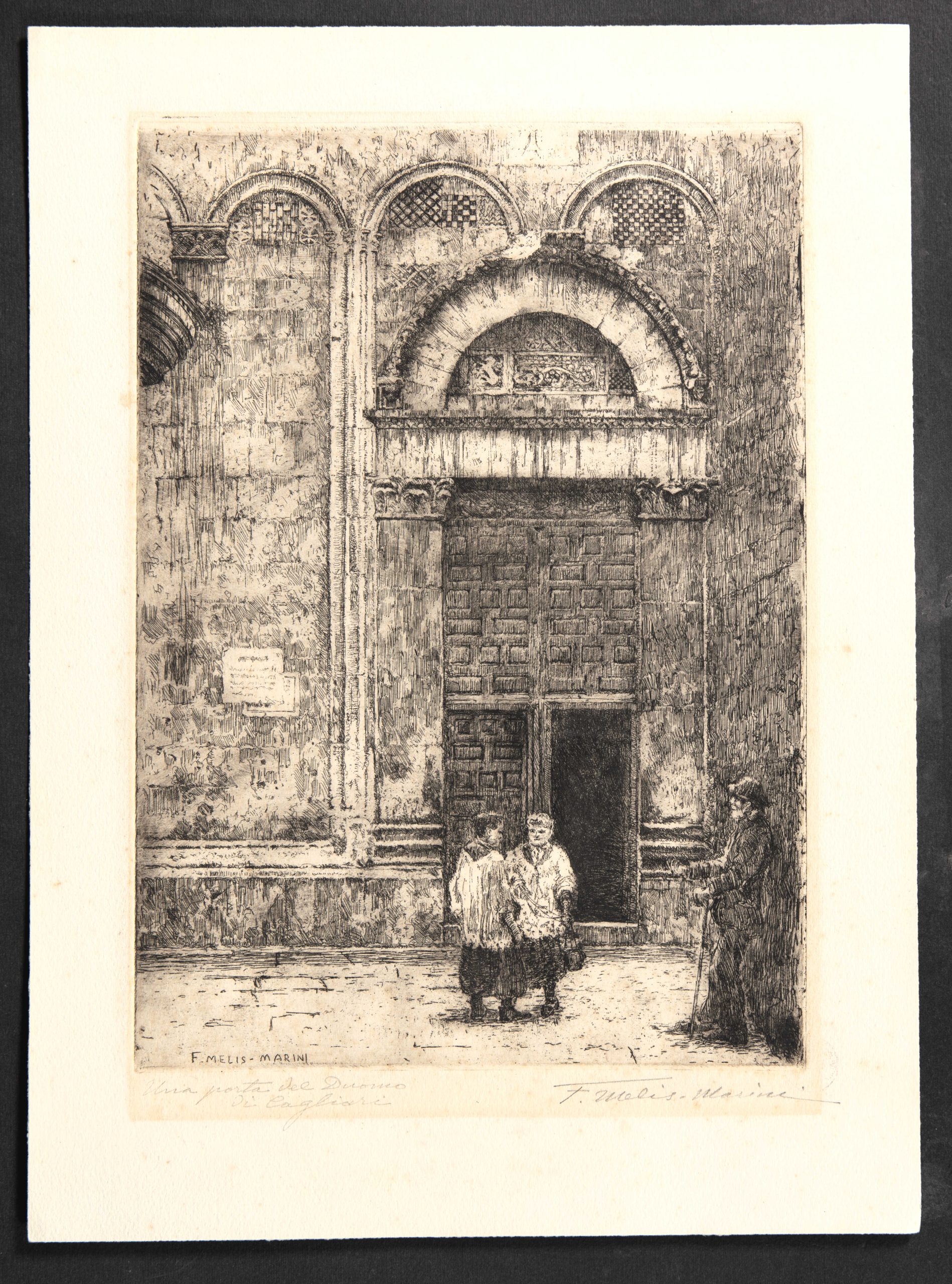 Felice Melis Marini (Cagliari 1871–1953) fu uno dei principali incisori sardi del Novecento e una figura centrale per la diffusione dell’acquaforte in Sardegna, tecnica sulla quale scrisse nel 1916 un manuale pratico che ebbe grande influenza sugli artisti locali. Formatosi tra Roma, dove frequentò la Scuola Libera del Nudo e la Calcografia Nazionale, e Venezia, dedicò gran parte della sua produzione grafica al paesaggio: scorci di villaggi sardi, vedute dello stagno di Cagliari, ma anche la laguna veneziana, i navigli di Milano, il paesaggio lombardo e romano. Nel 1947 collaborò all’arricchimento del Gabinetto delle Stampe della Biblioteca universitaria di Cagliari, donando un folto numero di incisioni, disegni e schizzi. Questo vasto patrimonio, che conta ben 492 incisioni e oltre 1000 tra schizzi appunti e disegni, documenta in modo esemplare la sua attività artistica e il suo ruolo nella storia dell’incisione italiana.